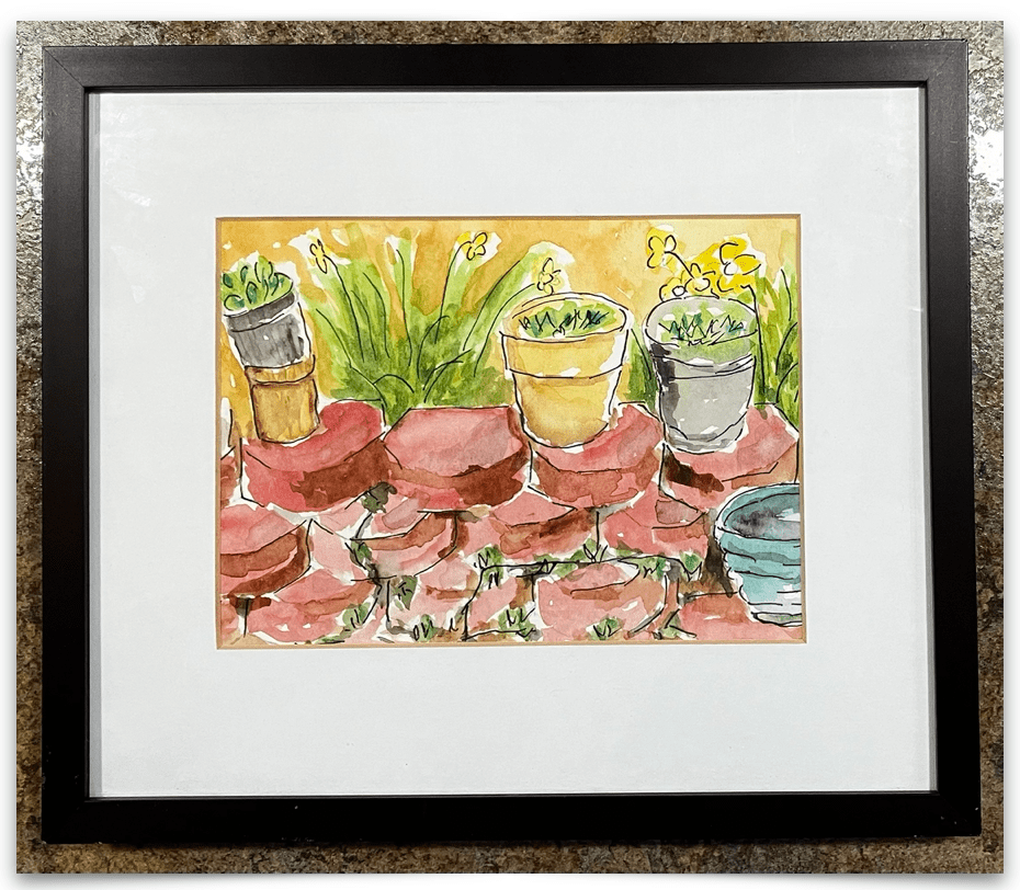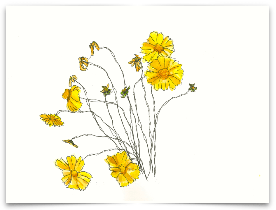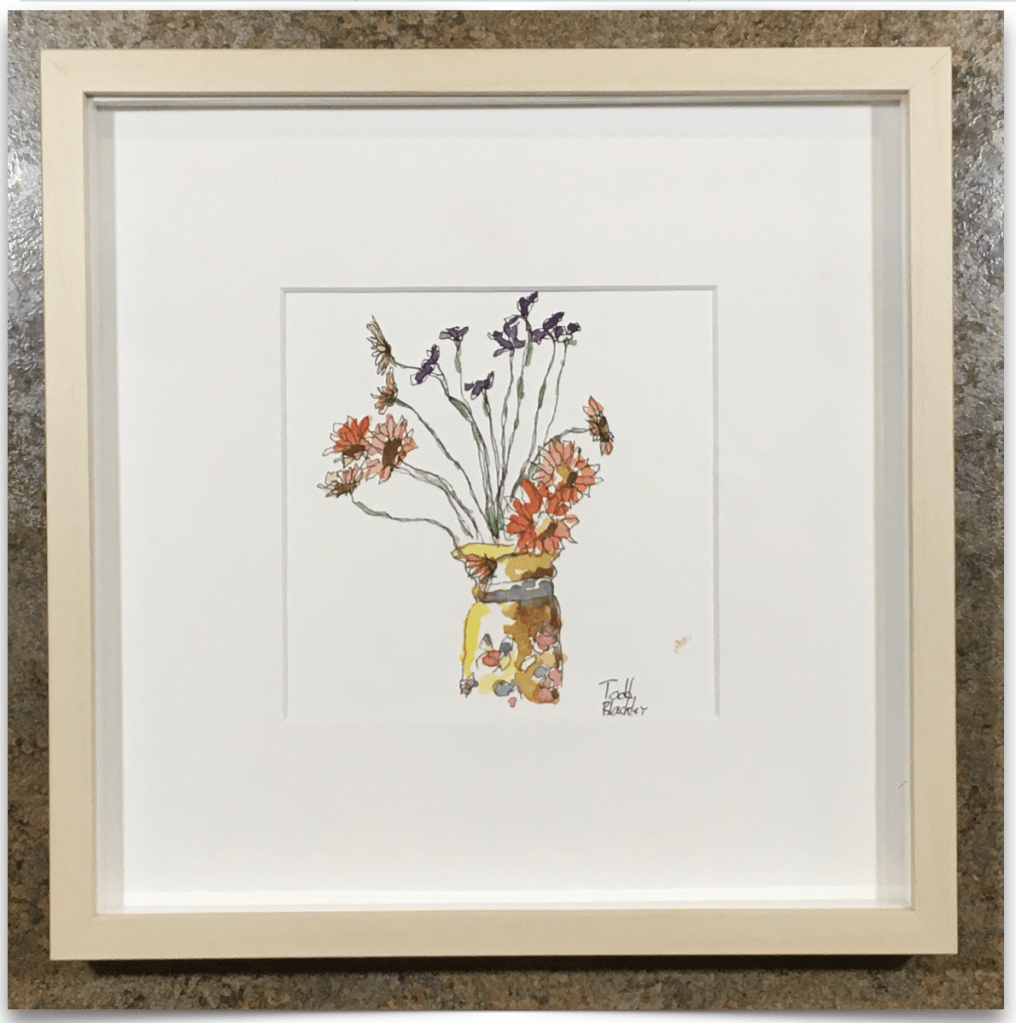 Ink and Watercolor, Approximately 5 x 5 inches. Just a painting of a vase of hand picked flowers Bobbie placed on the back porch table.
