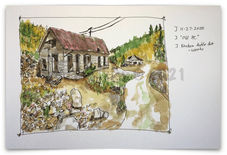 Ink and Watercolor, Approximately 8 x 10 inches. This is an old miners cabin in the canyon above old town Park City, UT. Hiked there 100’s of times. Lots of mining history in Park City and a great place to take your dog.