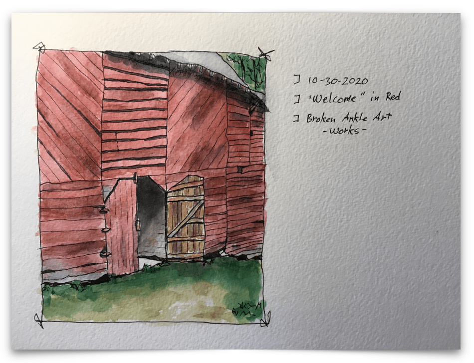 Ink and Watercolor, Approximately 5 x 8 inches. The front of a barn close to house in Mars Hill, NC.