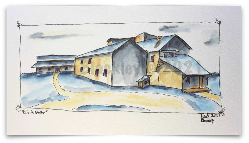 Ink and Watercolor, Approximately 8 x 8 inches. This is from a photo that Andy Feinstein took of an old Cotton Gin in snow. This was painted using Winsor & Newton watercolor markers.