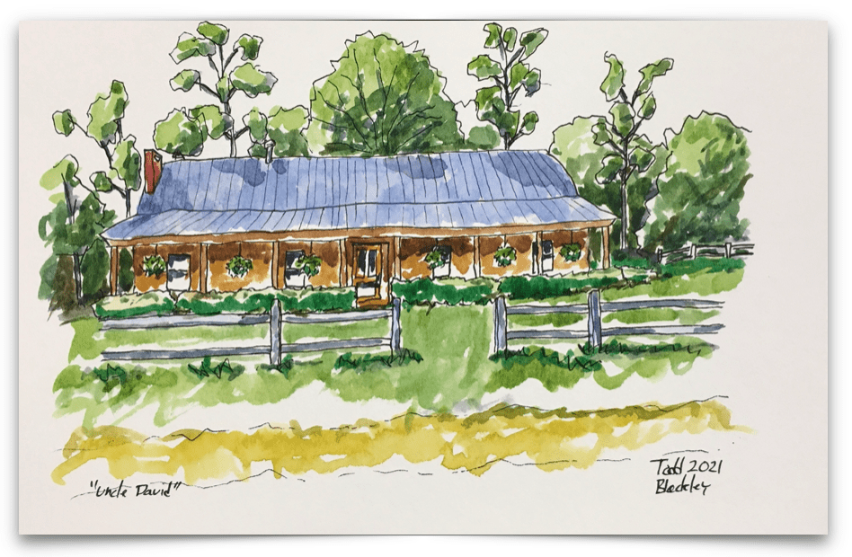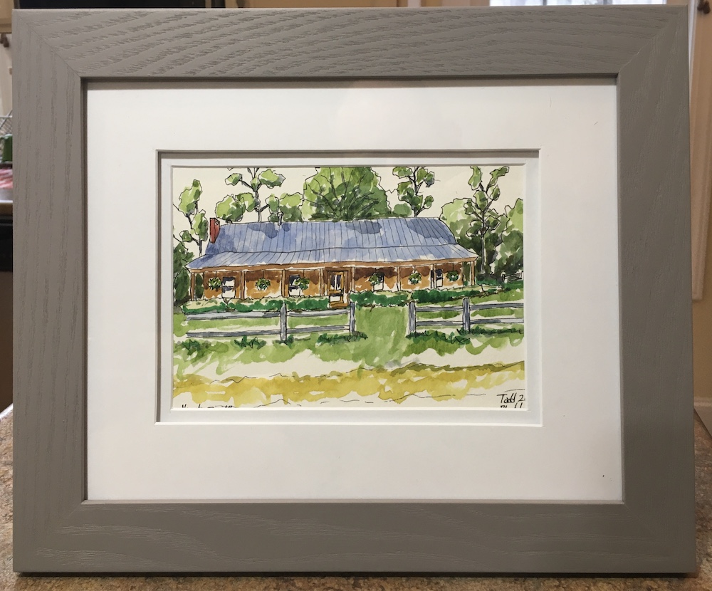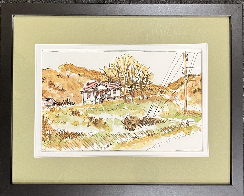 Ink and Watercolor, Approximately 5 x8 inches. This is of Bobbie’s uncle David’s house in Auburn, AL. and was framed and given to him as a present. Very nice and relaxing house in the rolling hills.