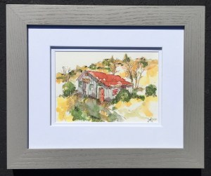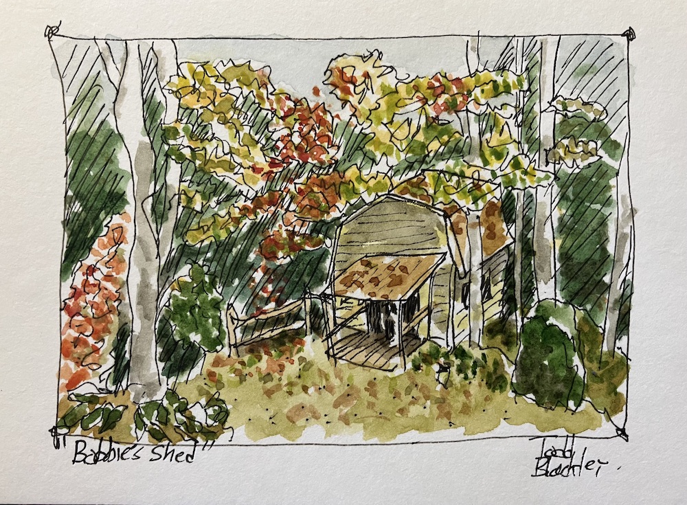 Ink and Watercolor, Approximately 3 x 5 inches. This is a painting of my wife’s writing shed in the backyard.
