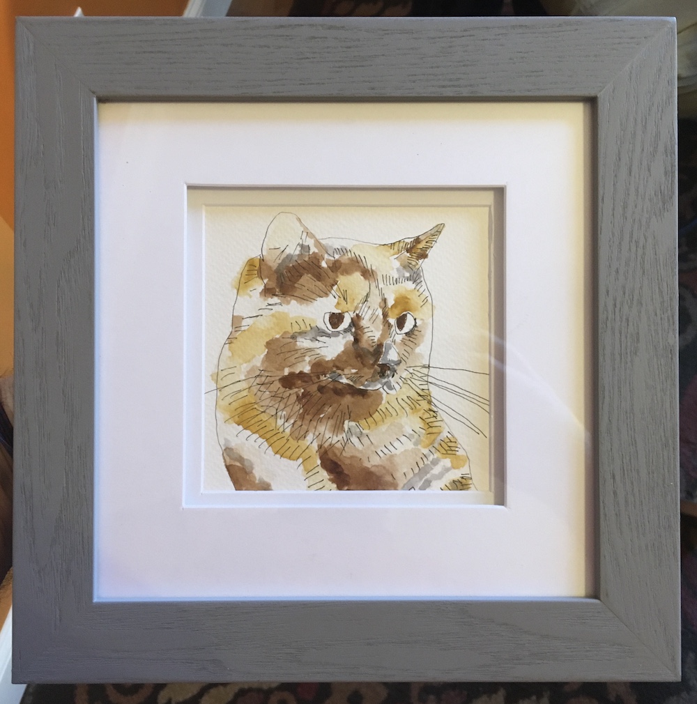Ink and Watercolor, Approximately 5 x 5 inches. I had a request from a friend to paint their cat. Cat’s and fur are just hard but this is my result.
