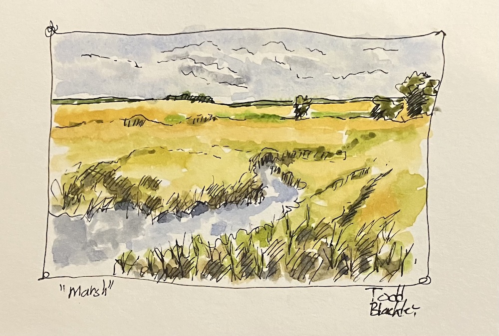 Ink and Watercolor, Approximately 3 x 5 inches. This is the marsh as you enter Dewee’s island, SC.