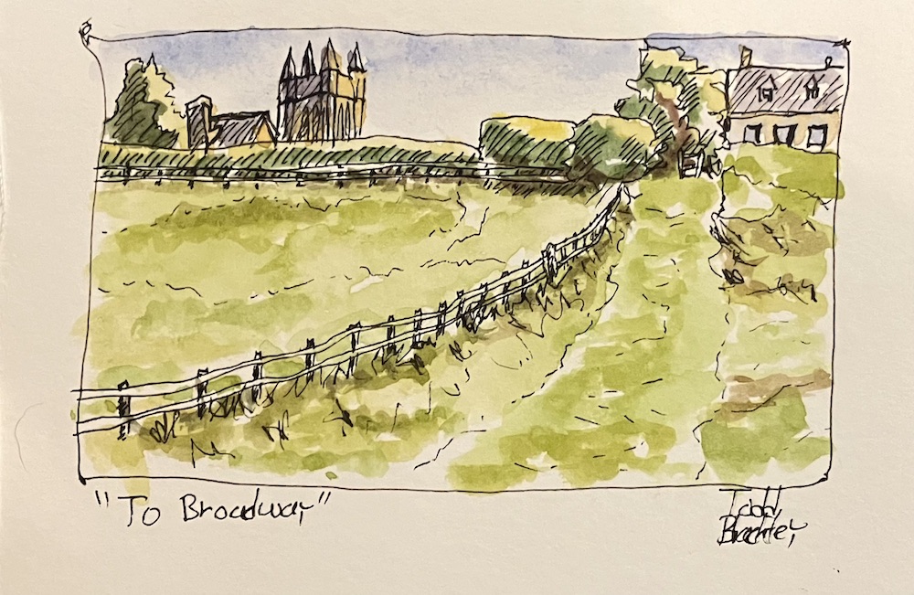 Ink and Watercolor, Approximately 3 x 5 inches. This part of the Cotswold way in the UK.