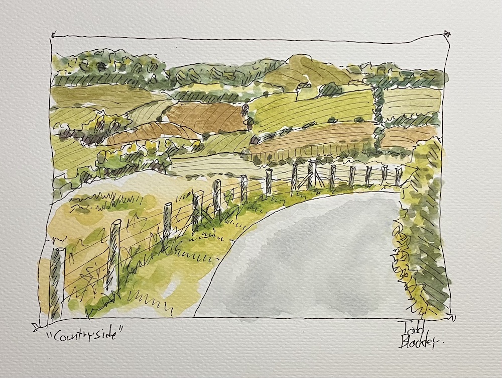 Ink and Watercolor, Approximately 5 x 7 inches. This is part of a view from the Cotswold way in the UK.