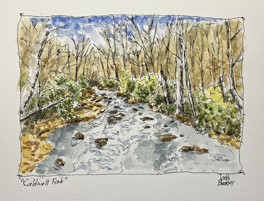 Ink and Watercolor, Approximately 5 x 7 inches. The creek next to the “Boogerman” trail in GSMNP.